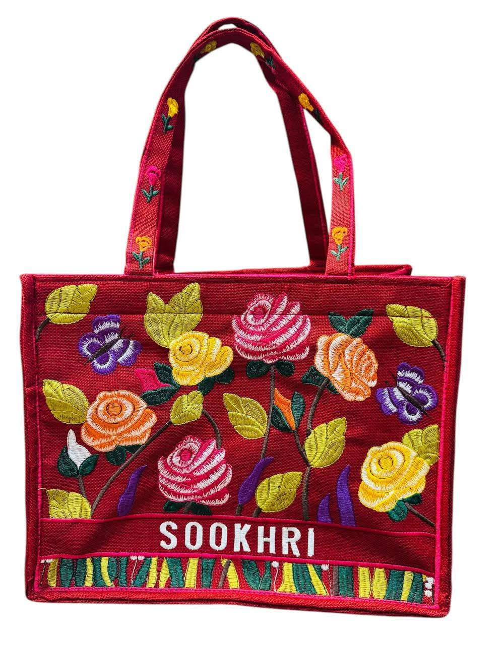 The word “SOOKHRI,” which translates to “Sughat,” is elegantly embroidered in a stylish white thread, centered on the top portion of the tote. This adds a personal touch, carrying a cultural significance that resonates with many. Gift this bag to yourself or a loved one as a unique cultural gift that embodies thoughtful craftsmanship and aesthetic appeal.